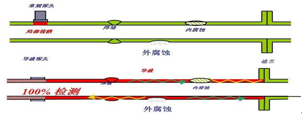 正确选择导波模式和频率,并控制其传播方向,MsS导波可以从其传感器位置,沿着构件传播瞬间完成长距离管道100%检测 ,下面是导波技术同常规超声波技术的对比: